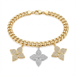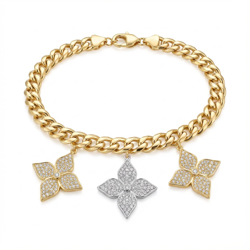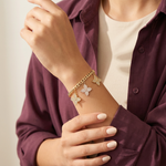أسورة مصنوعة من الذهب عيار 18 بتصميم جنزير متناسق، تتدلى منها تعليقات على شكل زهرة الكاميليا بتفاصيل دقيقة ومظهر متوازن. الترتيب المتناغم للتعليقات يضفي حركة خفيفة وأناقة راقية على المعصم، ما يجعلها مناسبة للارتداء اليومي أو لتنسيق إطلالة أنثوية دون مبالغة.