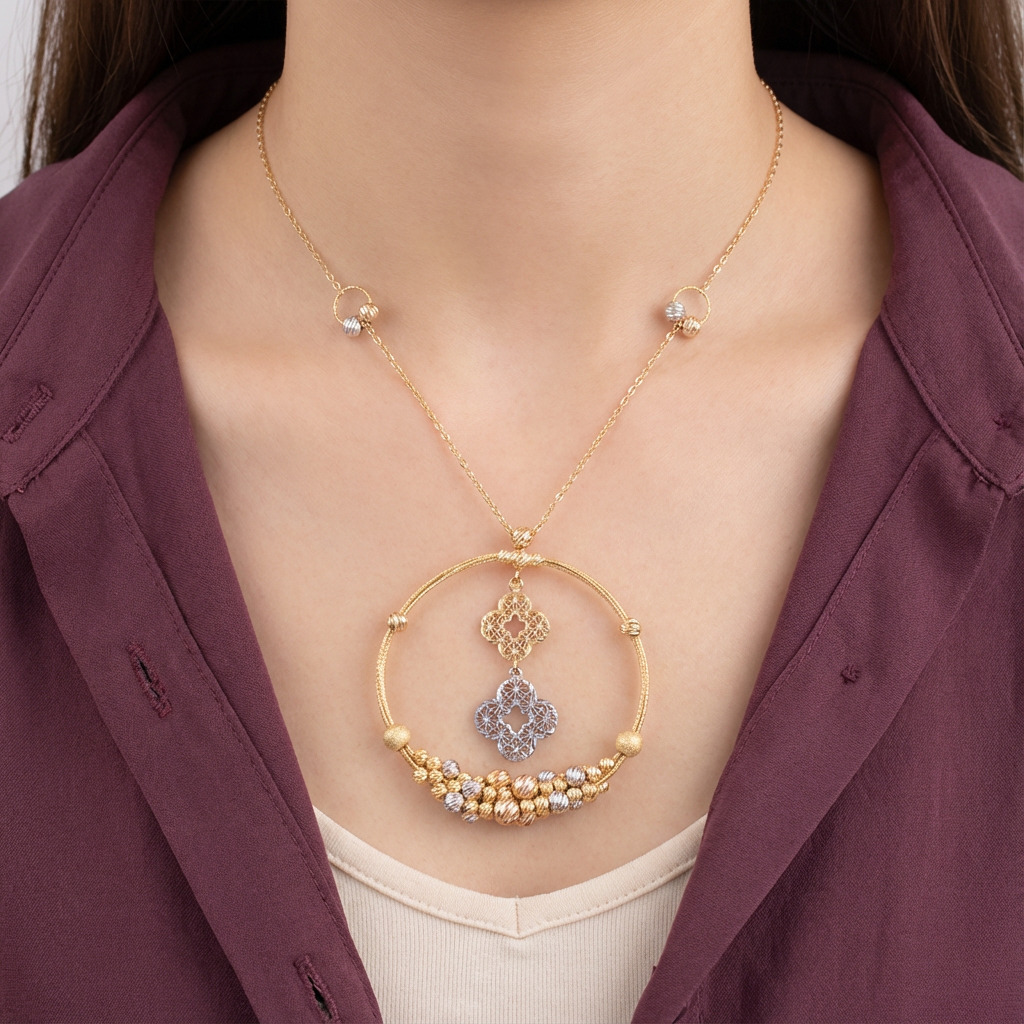 سعر الوحدة لكلعقد ذهب عيار 18 بتصميم دائري مزخرف مع تفاصيل هندسية وحبات يمنح إطلالة مميزة ولافتة. تصميمه الفريد يجعله قطعة مثالية للإطلالات اليومية والمناسبات الخاصة.