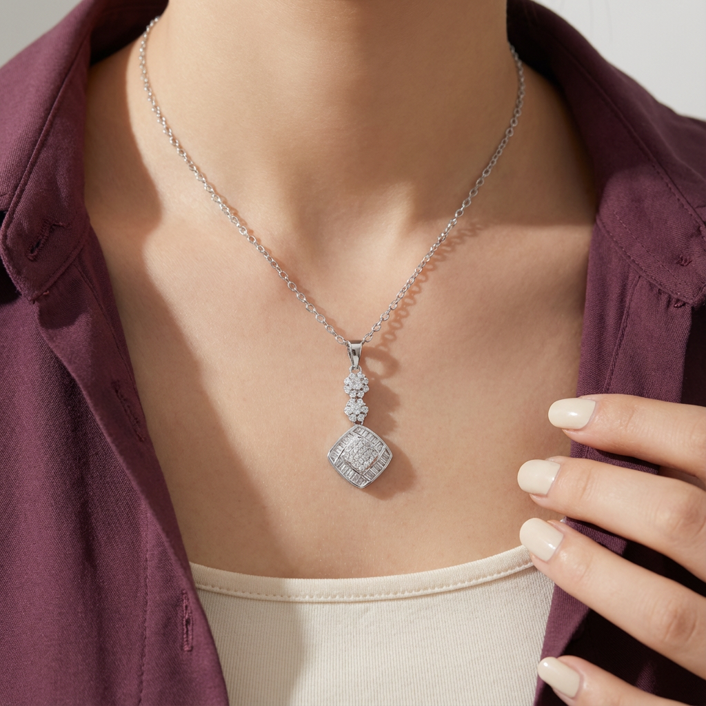 سعر الوحدة لكلعقد ذهب عيار 18 بتعليقة تجمع بين تصميم مربع وتفاصيل زهرية مزينة بفصوص تمنحه مظهراً فاخراً ولافتاً. قطعة أنيقة تناسب المناسبات والإطلالات الراقية.