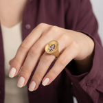 خاتم ذهب عيار 18 بتصميم بيضاوي أنيق تتوسطه مجموعة فصوص ملونة تضيف لمسة حيوية وبريقاً مميزاً. قطعة تجمع بين التفاصيل الراقية واللمسة الفنية لتناسب الإطلالات المختلفة.