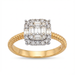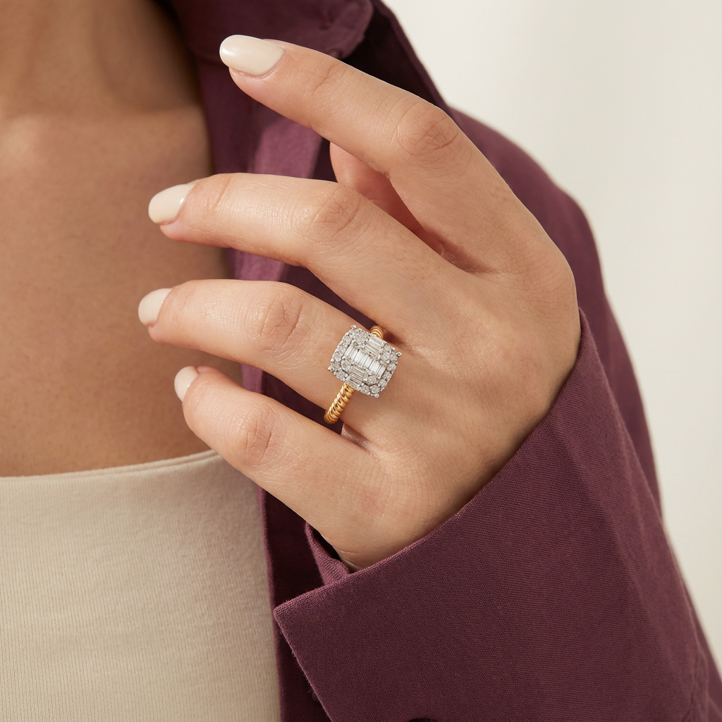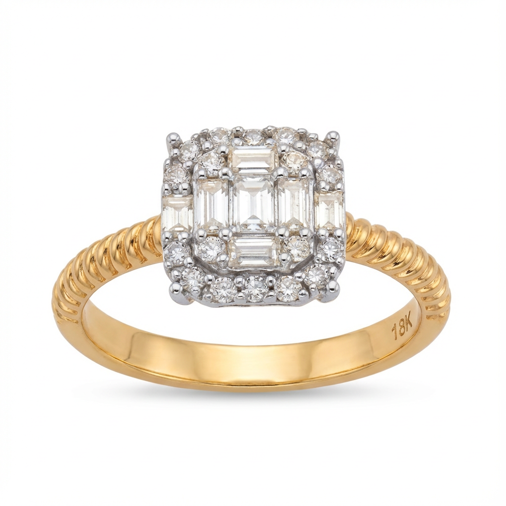 دبلة عيار 18 يتوسطه فص ألماس كبير لامع يلفت الأنظار، صنع ليكون قطعة مركزية تبرز جمال يدك بكل تفاصيلها.