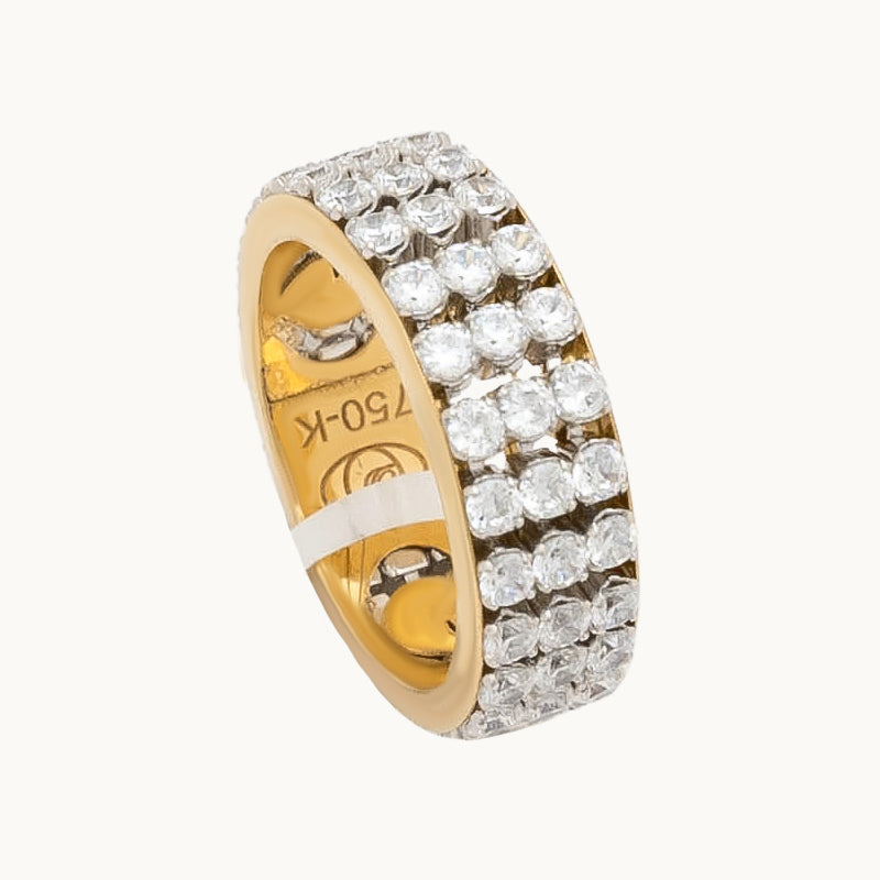 سعر الوحدة لكلدبلة من الذهب عيار 18 بتصميم عريض مغطى بثلاث صفوف متتالية من الفصوص البيضاء اللامعة، ما يمنحه مظهراً راقياً ومشرقاً. يتميز الخاتم بتصميم ناعم من الداخل مع إطار ذهبي واضح يبرز لمعانه وأناقة التصميم، ليكون خياراً مثالياً للإطلالات اليومية والمناسبات.