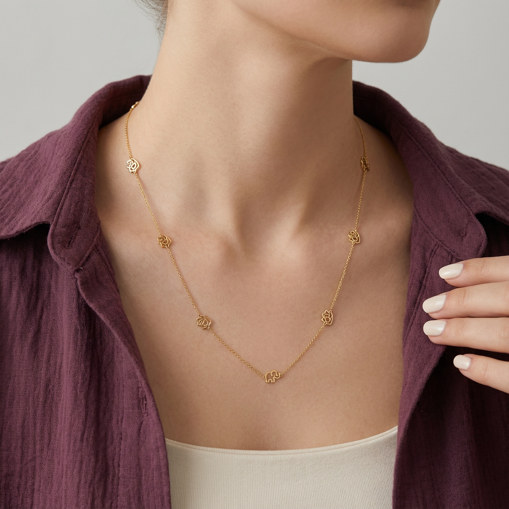 سعر الوحدة لكلشال رائحة الجمال مصنوع من الذهب عيار 18 بتصميم طويل وانسيابي، تتوزع عليه تعليقات على شكل زهور صغيرة متدلية بتوازن على طول السلسلة. التفاصيل الرقيقة وحركة التعليقات تمنح القطعة حضوراً ناعماً وأنيقاً، ما يجعلها مناسبة لتنسيق الإطلالات اليومية أو المسائية دون مبالغة.