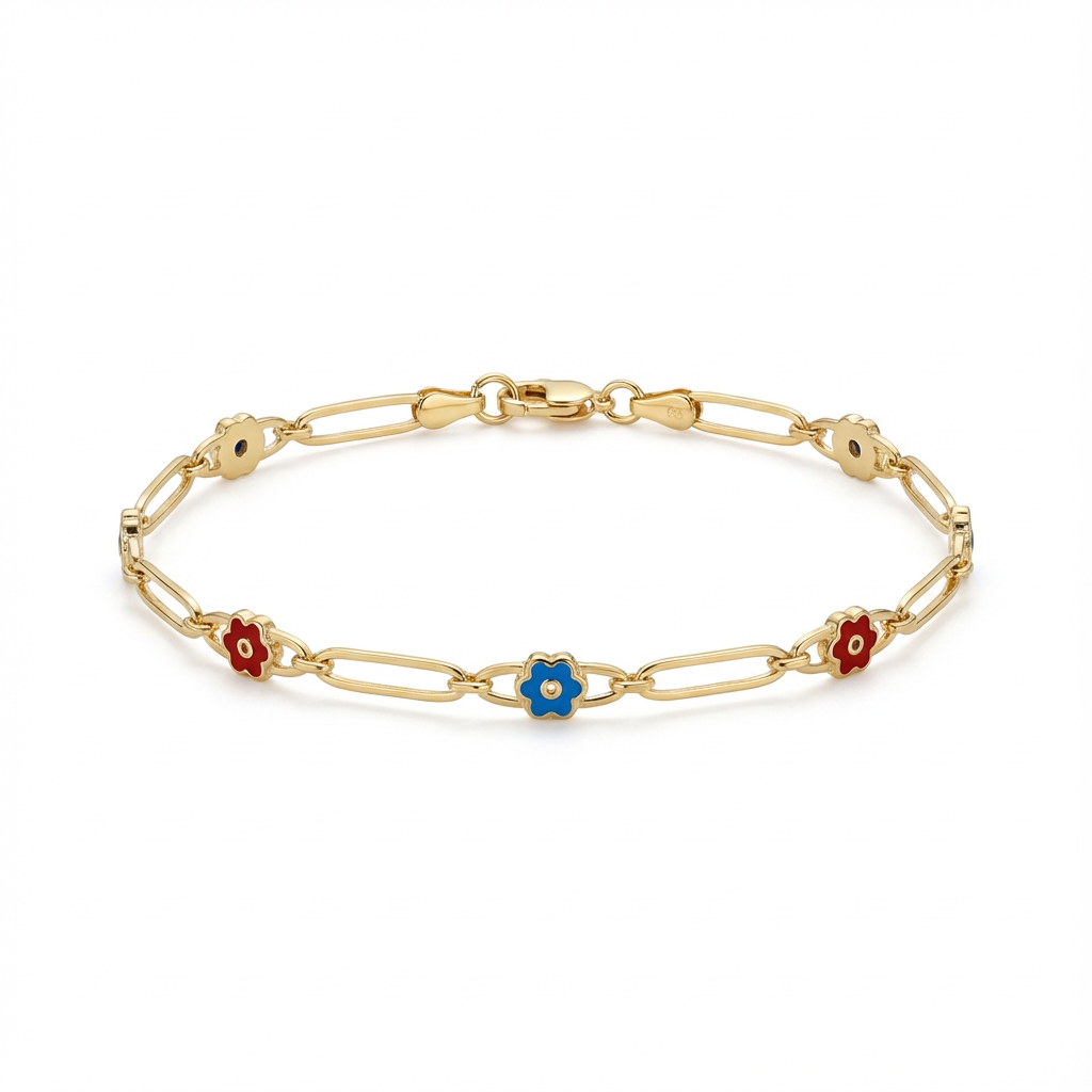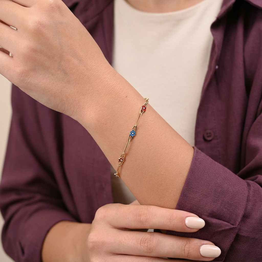 سعر الوحدة لكلأسورة مصنوعة من الذهب عيار 18 بتصميم نحيف وأنيق، تتوزع عليها تعليقات صغيرة على شكل زهرة بتفاصيل واضحة ومتناسقة. التصميم البسيط والخفيف يمنح المعصم حضوراً ناعماً وهادئاً، ما يجعلها مناسبة للارتداء اليومي أو لتنسيق إطلالة أنثوية دون مبالغة.