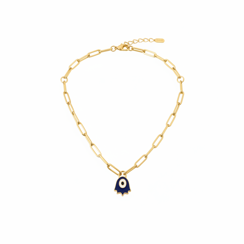 سعر الوحدة لكلعقد ذهب عيار 18 من غامية بسلسلة حلقات طويلة متتابعة يتدلى منها عنصر على شكل يد بزخرفة دائرية زرقاء في المنتصف مع حواف محددة ولمسة معدنية مصقولة تمنح القطعة مظهرًا واضح التفاصيل عند الارتداء.