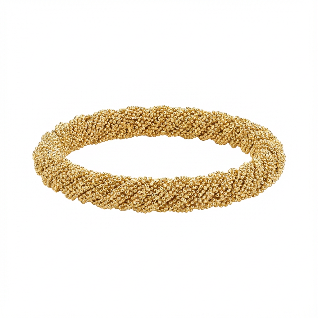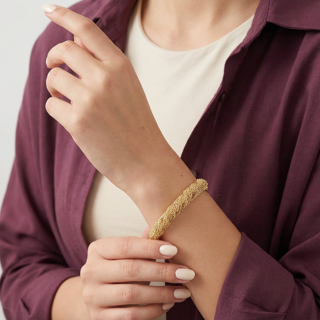 سعر الوحدة لكلأسورة زينه مصنوعة من الذهب عيار 18 بتصميم مجدول كثيف يظهر تفاصيل دقيقة ومتناسقة على كامل القطعة. يمنح هذا الأسلوب الكلاسيكي حضوراً واضحاً على المعصم مع لمسة فاخرة هادئة، ما يجعلها مناسبة للارتداء اليومي أو لتنسيق إطلالة راقية دون مبالغة.