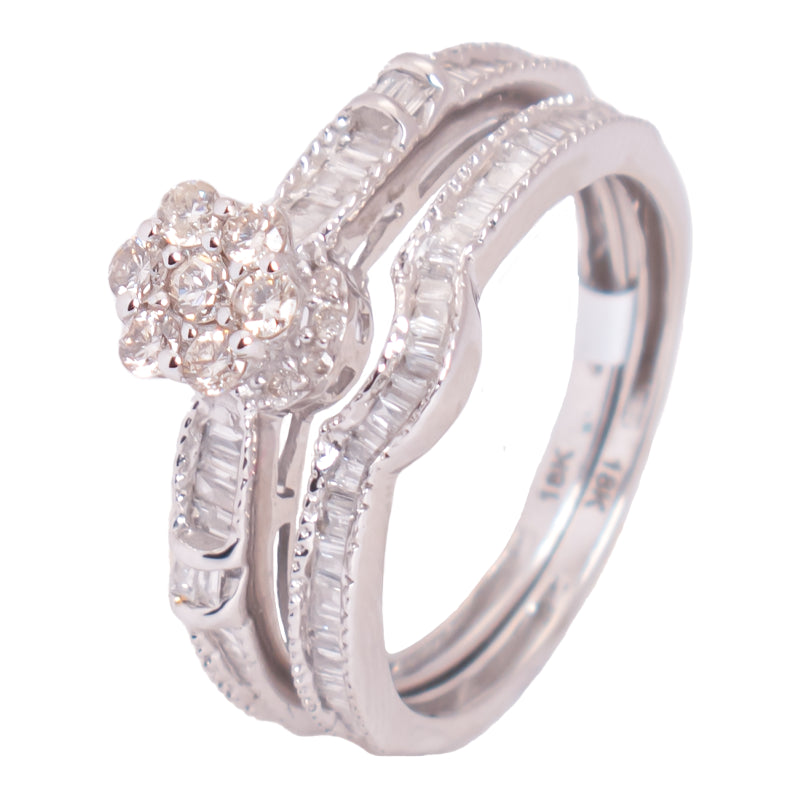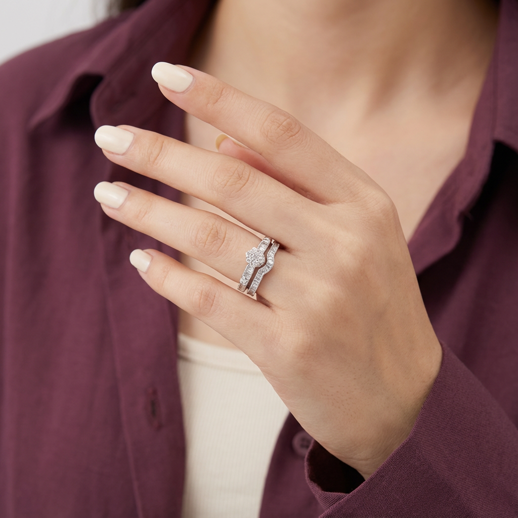 خاتم توينز ألماس عيار 18 بتصميم مرصع بفصوص بيضاء متراصة، يظهر التناسق بين الخاتمين مع تشطيب دقيق ولمسة أنيقة دون مبالغة.