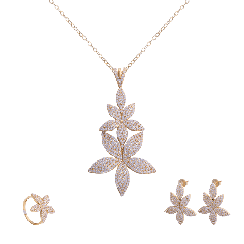 سعر الوحدة لكلتناغم مثالي يجمع بين الأبداع والنعومة مع طقم مشرقة، المصمم علي شكل زهرة يجمع بين الذهب عيار 18 وفصوص بيضاء لامعة. يأتي الطقم إليكي بثلاث قطع، عقد، خاتم وأقراط.