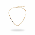 سعر الوحدة لكلعقد ذهب عيار 18 من غامية بتصميم يعتمد على زهور ملونة موزعة على طول السلسلة مع حلقات ذهبية متتابعة، ويظهر العقد بتناسق واضح في توزيع العناصر وتفاصيل معدنية دقيقة تمنحه مظهرًا متوازنًا عند الارتداء.