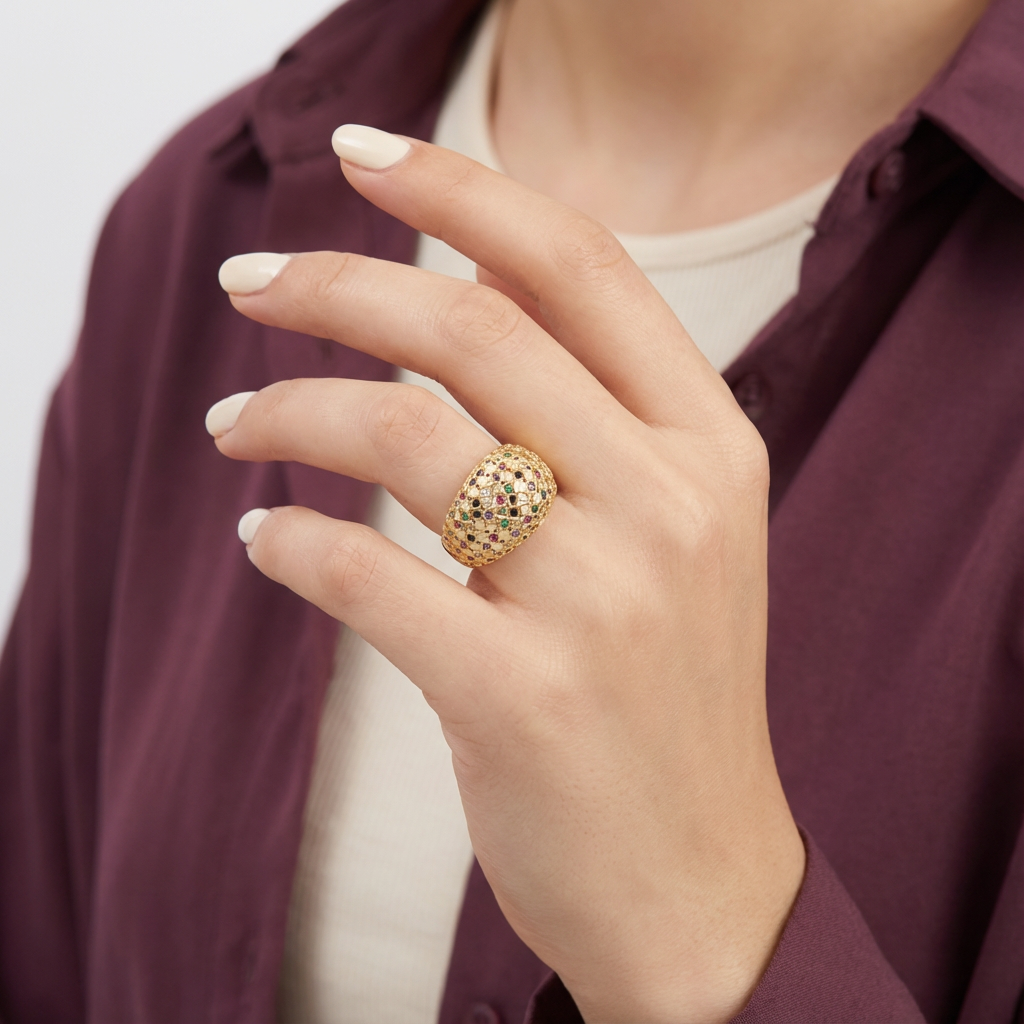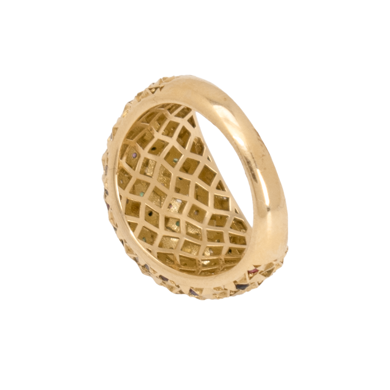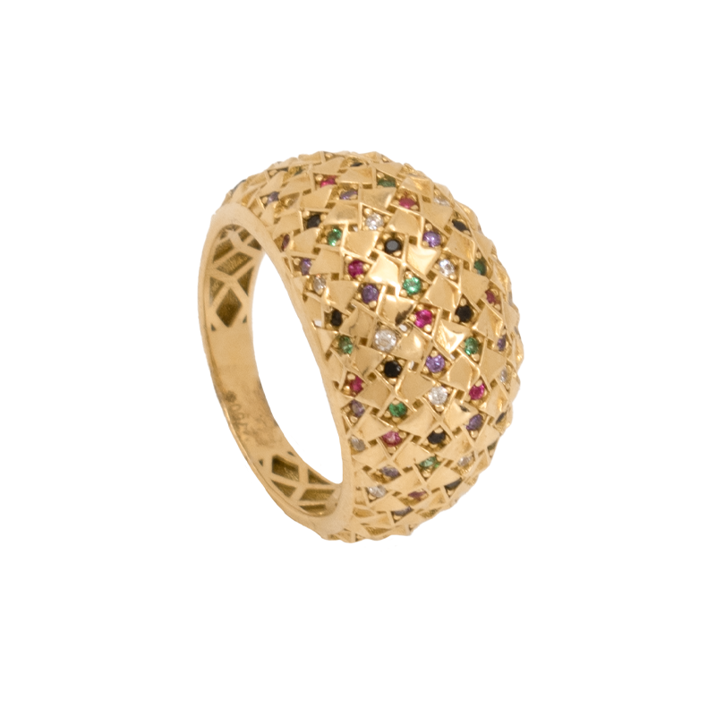 سعر الوحدة لكلخاتم ذهب عيار 18 مزخرف بتصميم استثنائي يبرز تألقك مع فصوص ملونة، تجذب أنظار من حولك من رقي التصميم.