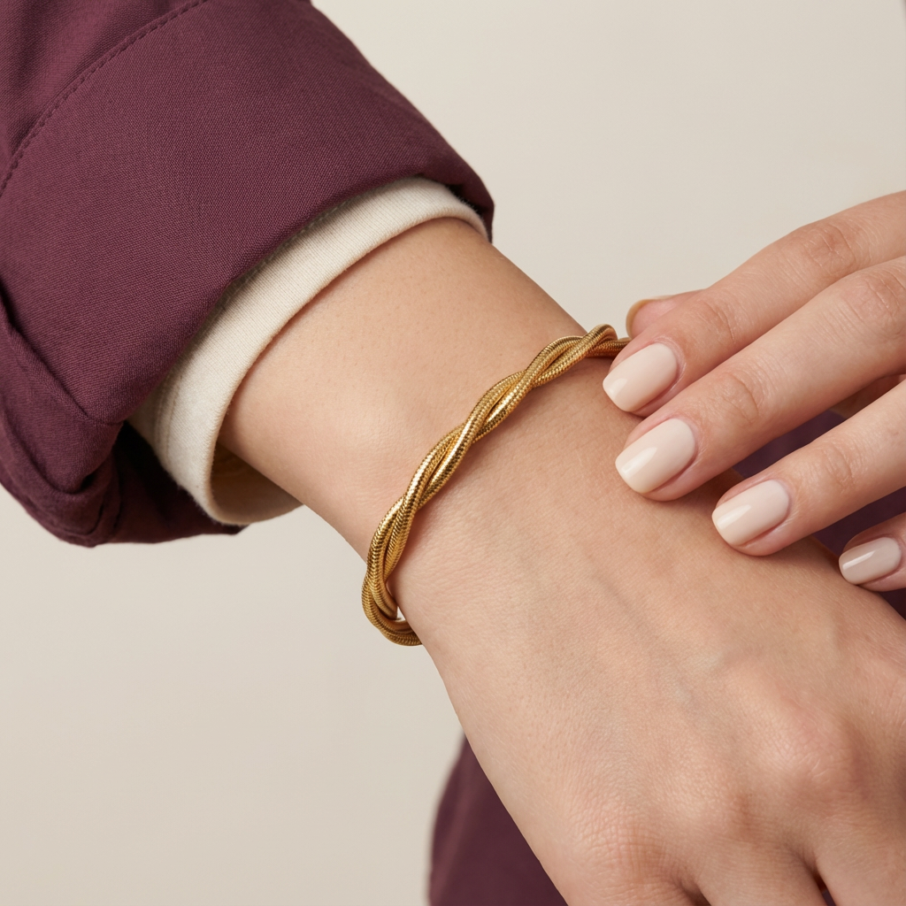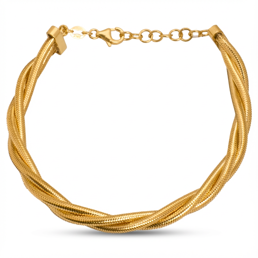 تأتي هذه الأسورة من غامية مصنوعة من ذهب عيار 21 بتصميم مجدول فاخر يجمع بين عدة خيوط ملتوية تمنحها مظهراً كلاسيكياً أنيقاً.