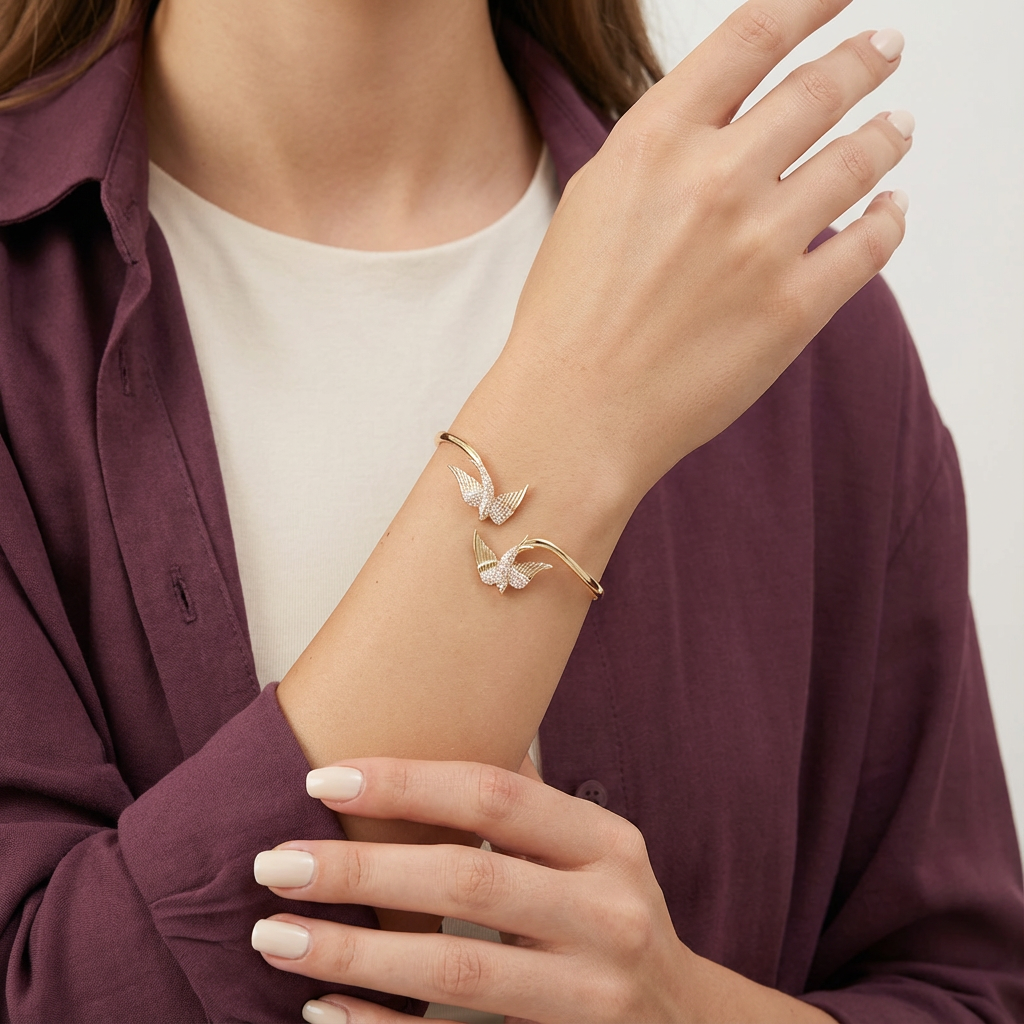 Unit price perأسورة مصنوعة من الذهب عيار 18 بتصميم فني مستوحى من طيور السلام المتقابلة، تظهر بتفاصيل دقيقة وخطوط منحنية أنيقة تعطي القطعة طابعاً رمزياً راقياً. التصميم المتوازن يضيف لمسة أنثوية هادئة، ما يجعلها مناسبة للارتداء اليومي أو لإكمال إطلالة تعبّر عن الأناقة والمعنى دون مبالغة.