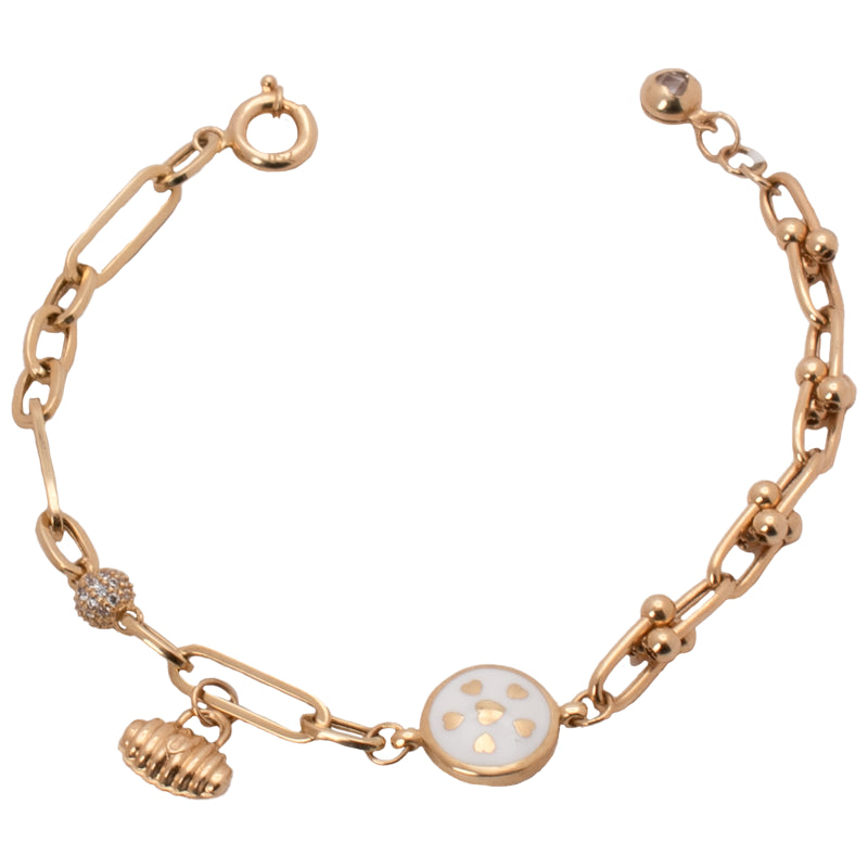 Unit price perأسورة مصنوعة من الذهب عيار 18 بتصميم جنزير ناعم، تتوسطها تعليقة دائرية بيضاء بارزة مع تعليقات صغيرة متدلية تضيف حركة خفيفة وأناقة متوازنة. بساطة الشكل الدائري وتناسق التفاصيل يمنحان القطعة حضوراً عصرياً ناعماً، ما يجعلها مناسبة للارتداء اليومي دون مبالغة.